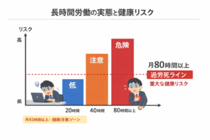 月80時間を超えると、いわゆる「過労死ライン」とされる水準です。